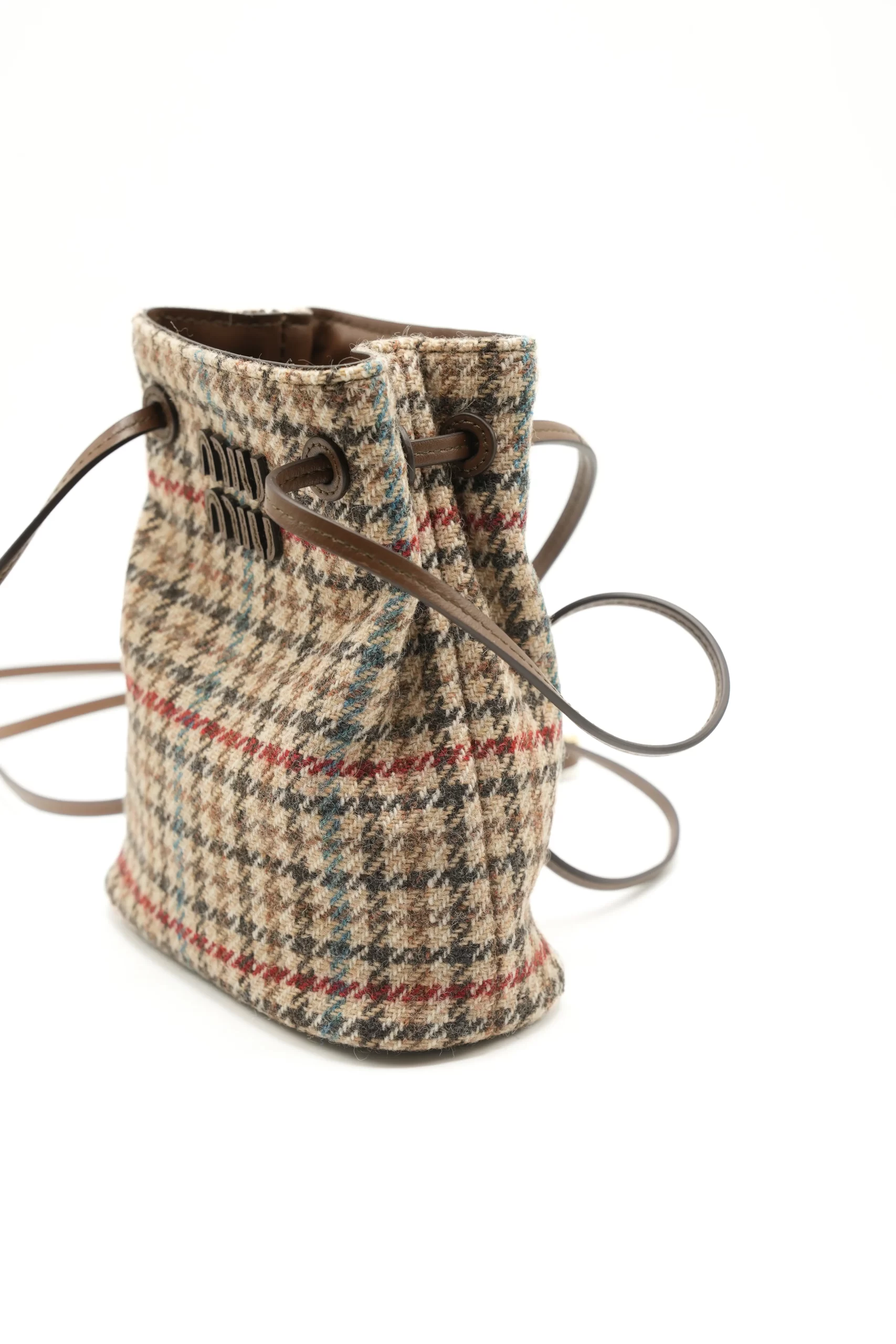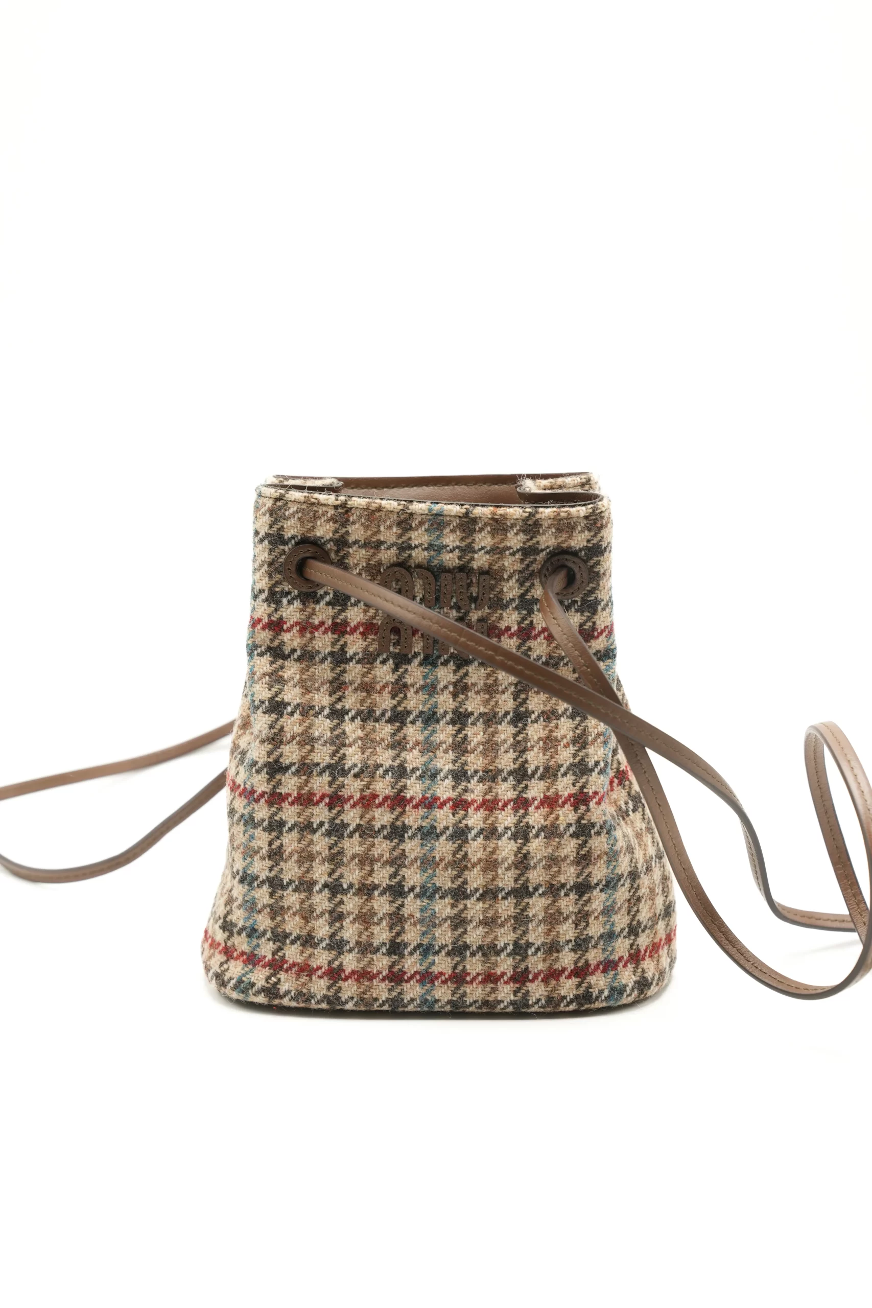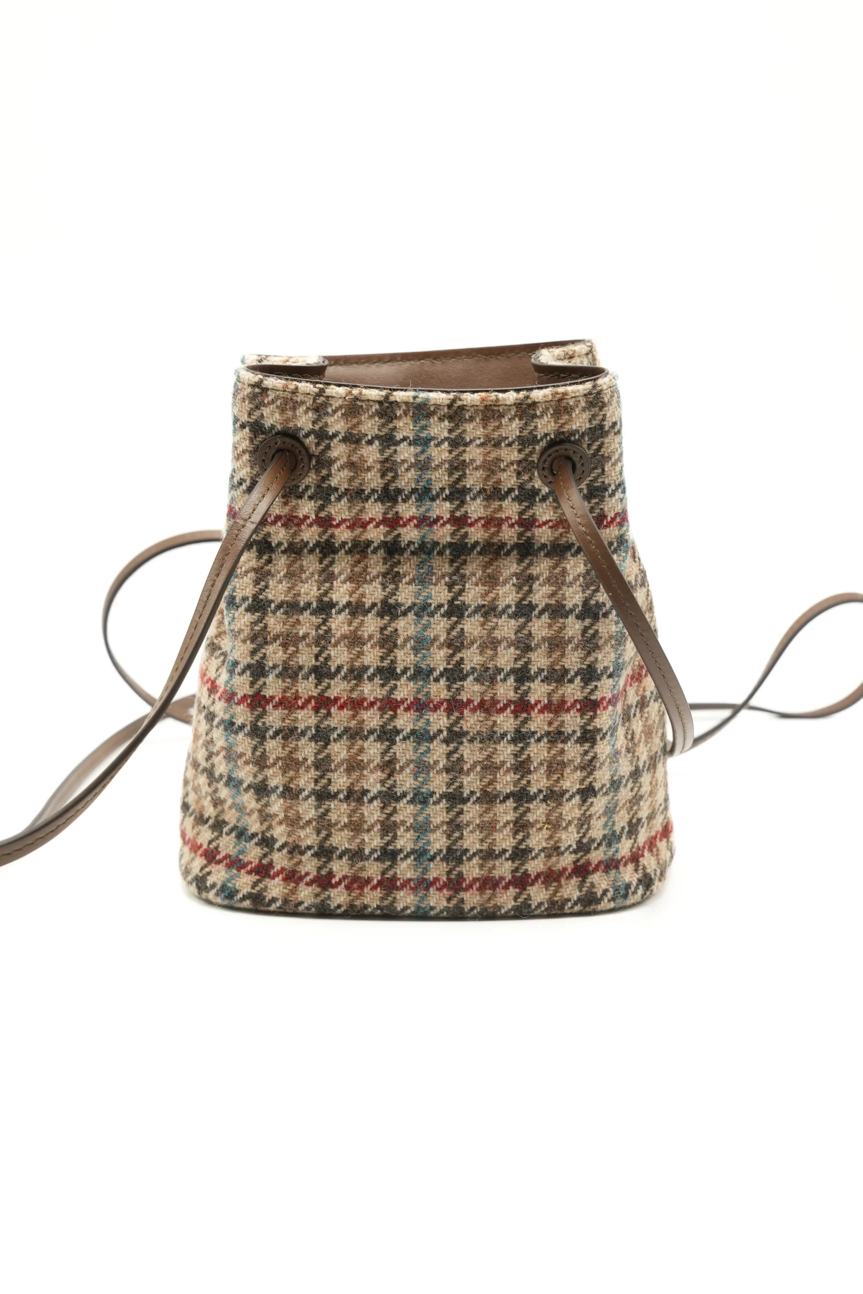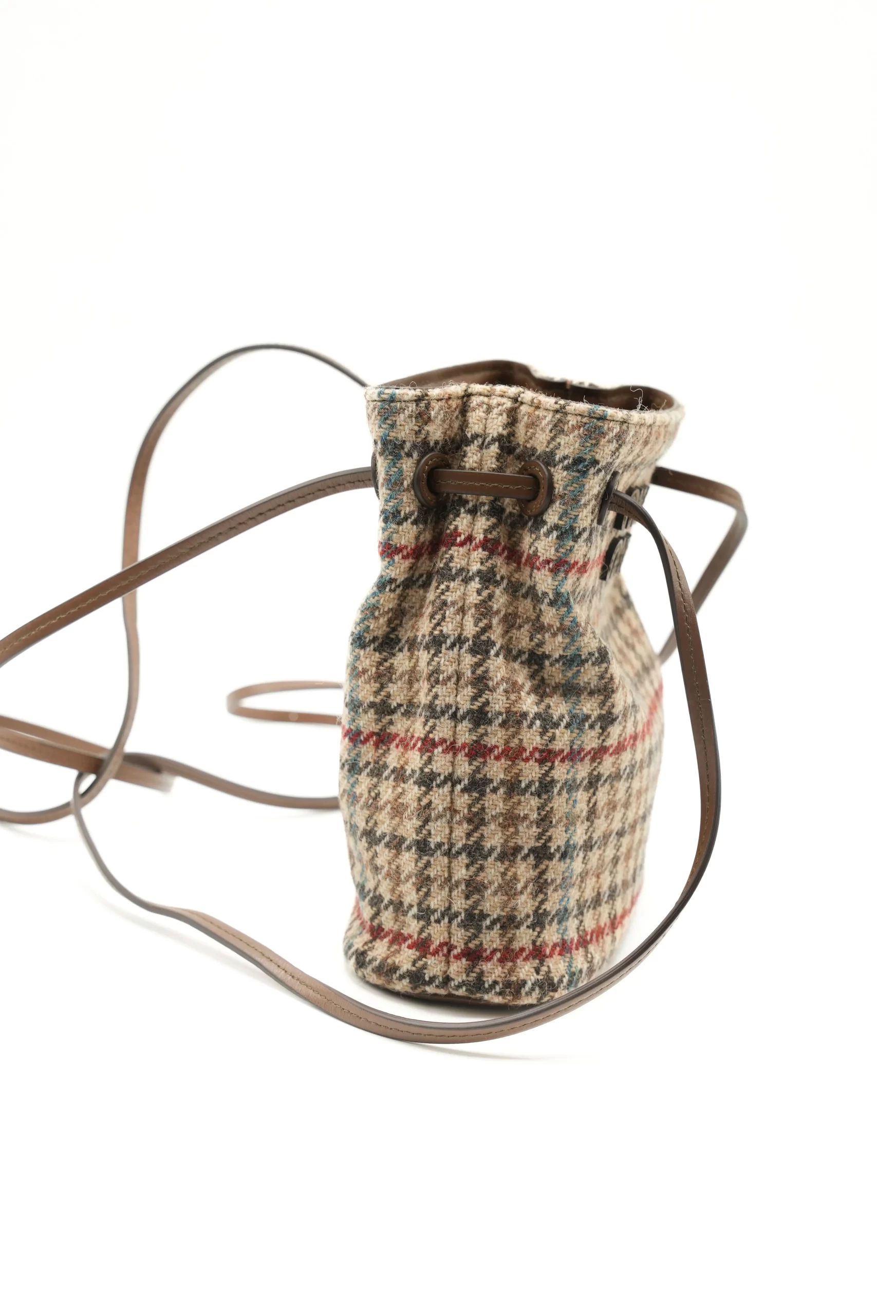 DETAY: kumaş retro desen kahve tonlarında deri askı detaylı büzmeli çanta