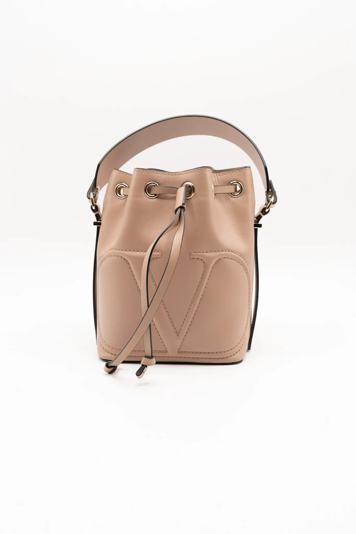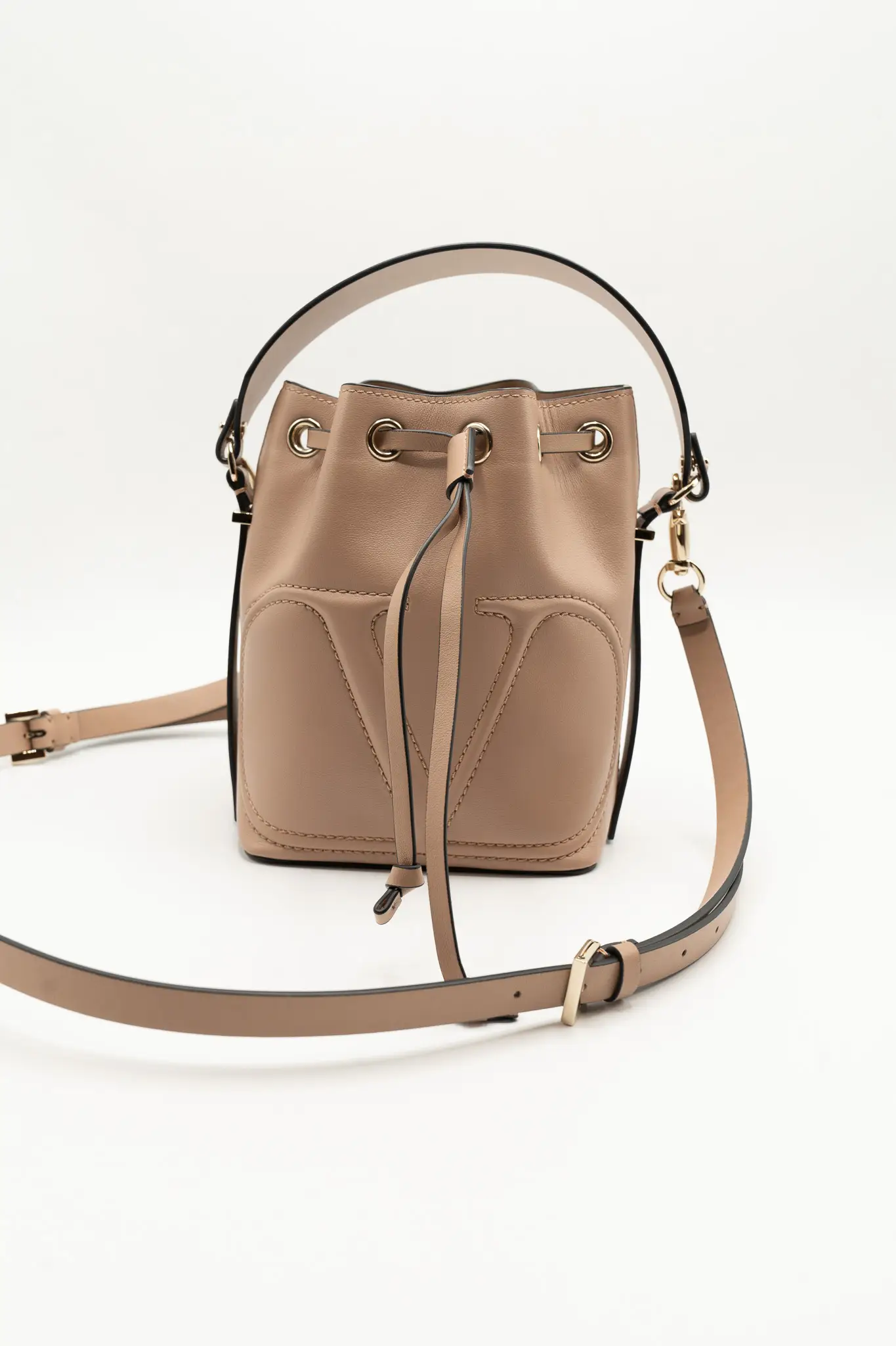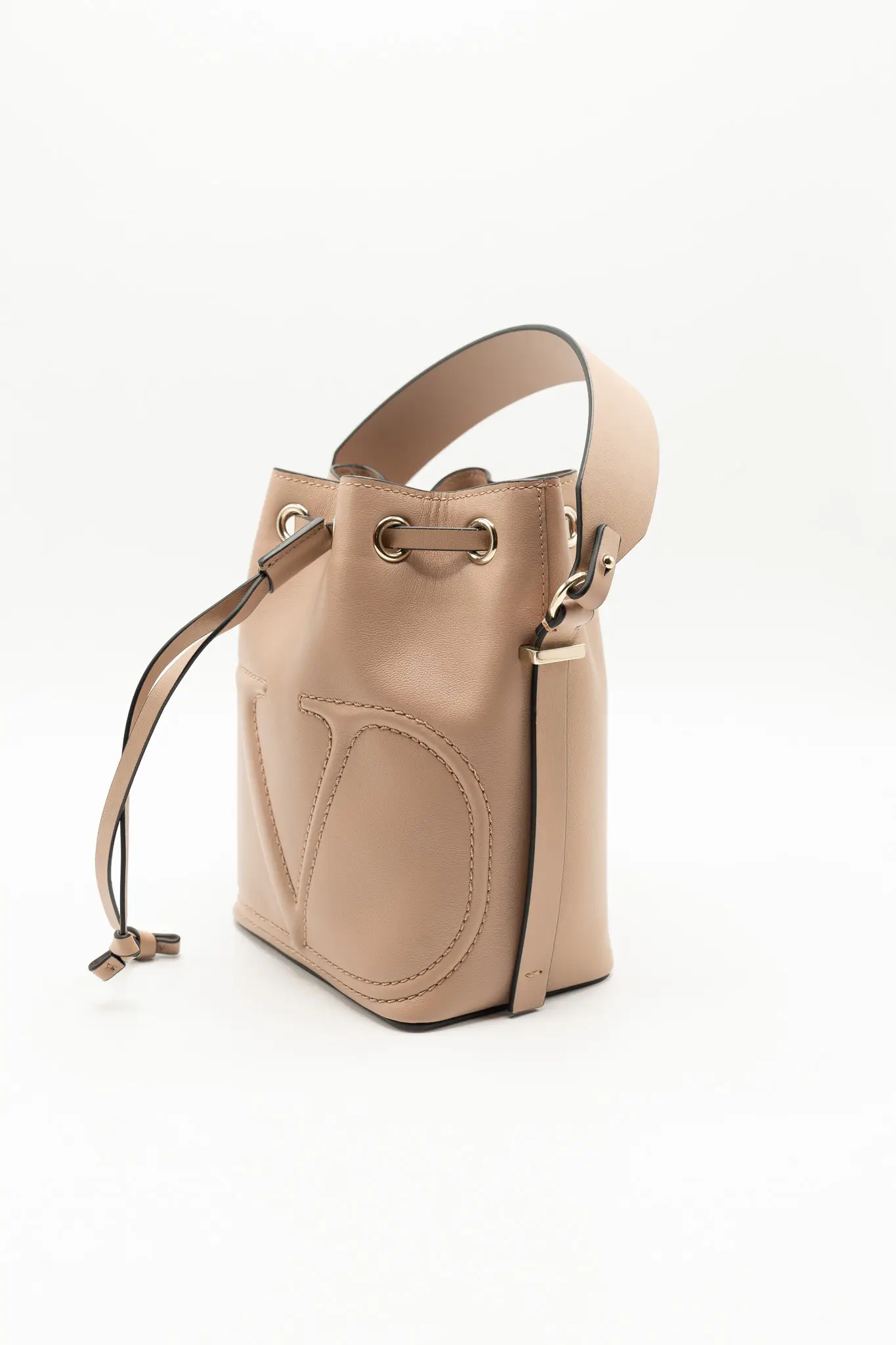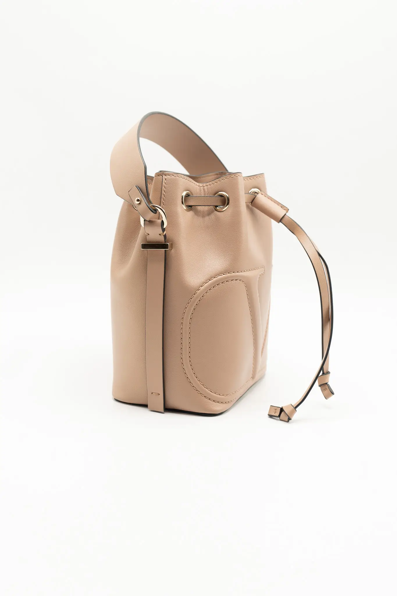 +KargoDETAY: nude renk ağız kısmı büzmeli torba formunda uzun deri askılı çanta